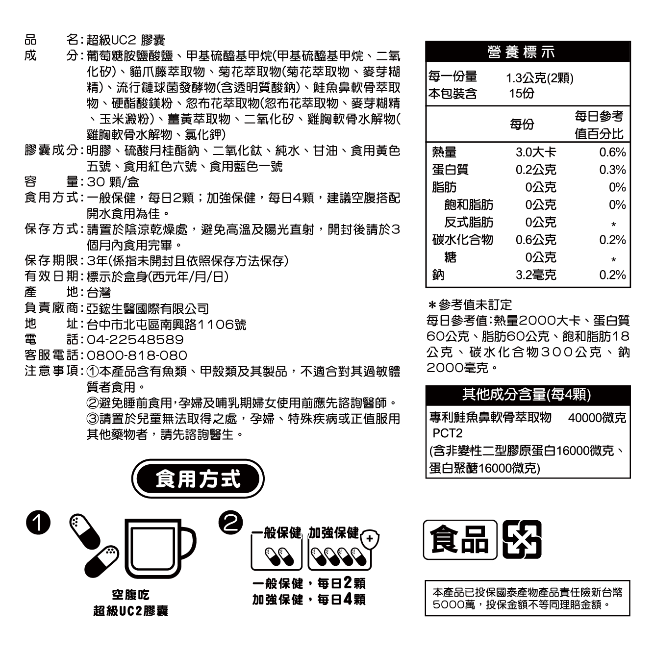 成分 | 葡萄糖胺鹽酸鹽、甲基硫醯基甲烷(甲基硫醯基甲烷、二氧化矽)、貓爪藤萃取物、菊花萃取物(菊花萃取物、麥芽糊精)、流行鏈球菌發酵物(含透明質酸鈉)、鮭魚鼻軟骨萃取物、硬酯酸鎂粉、忽布花萃取物(忽布花萃取物、麥芽糊精、玉米澱粉)、薑黃萃取物、二氧化 矽、雞胸軟骨水解物(雞胸軟骨水解物、氯化鉀) |